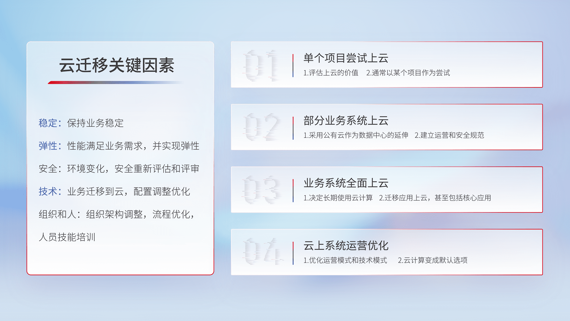 结合实际业务,,从规划设计、、、、云平台选型、、、云原生改造、、、、数据迁移、、、、集成交付,,,迁移全过程为客户识别最佳上云路径,,,做好风险识别管理,,,,设计网络架构、、、身份权限、、、安全审计合规、、、、操作审计、、日志审计、、、监控告警策略、、多站点容灾设计等,,,对云上基础设施进行整体规划,,,,提升IT治理水平,,,,以满足弹性、、高可用、、高性能的需求。。。