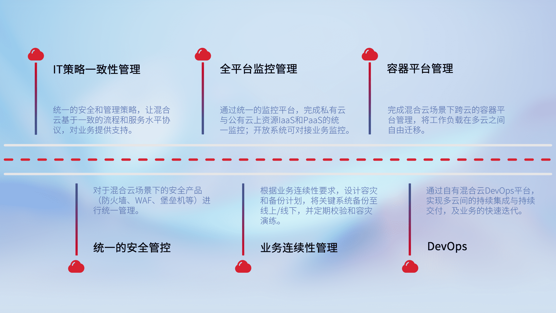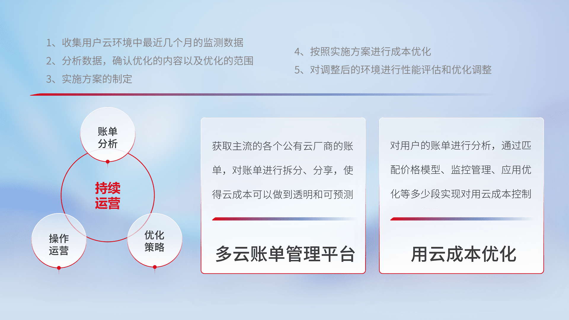 通过多云纳管,,以统一的资源数据模型把客户的云资源进行抽象和封装,,,进而实现对多云资源的统一操作,,,,保障云资源管理的可靠性、、、稳定性与可用性。。量身定制化运维内容,,,,配置、、开发运维、、、、补丁管理、、备份、、监控、、认证和访问管理、、、、审计和日常巡检等,,保障在用云过程中的可靠度,,稳定度以及高可用率。。。。